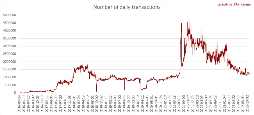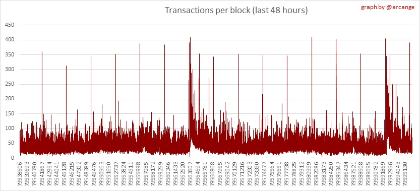 These graphs show the number of transactions per day, and the highest number of transactions per block, the average number of transactions per block, and the number of transactions per block for the last 48 hours. This gives you an idea of the whole activity on the blockchain.