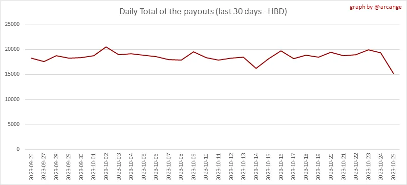 These graphs show the total of the distributed payout (posts and comments) for each day.