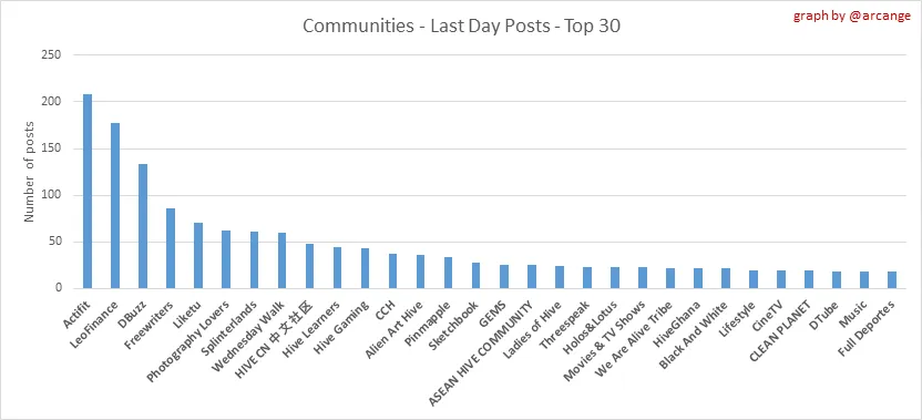 These graphs show the most active communities by number of posts (blockchain lifetime and last day).