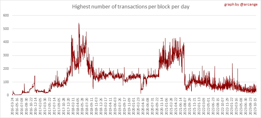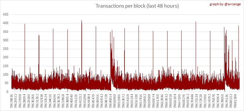 These graphs show the number of transactions per day, and the highest number of transactions per block, the average number of transactions per block, and the number of transactions per block for the last 48 hours. This gives you an idea of the whole activity on the blockchain.