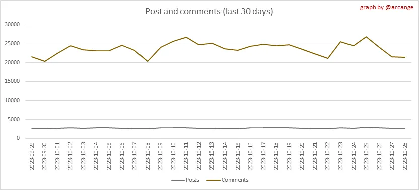These graphs show the evolution of posts and comments for the whole blockchain lifetime and the last 30 days.