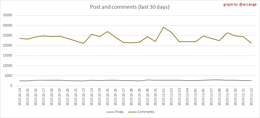 These graphs show the evolution of posts and comments for the whole blockchain lifetime and the last 30 days.