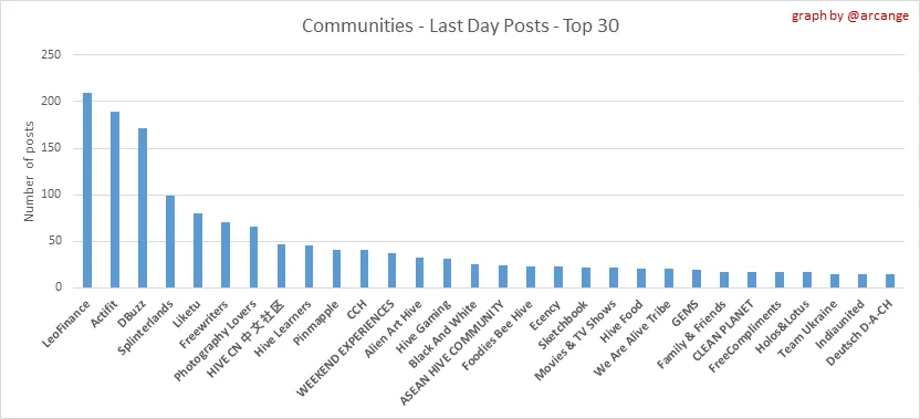 These graphs show the most active communities by number of posts (blockchain lifetime and last day).