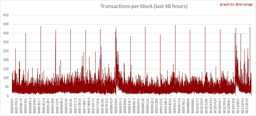 These graphs show the number of transactions per day, and the highest number of transactions per block, the average number of transactions per block, and the number of transactions per block for the last 48 hours. This gives you an idea of the whole activity on the blockchain.