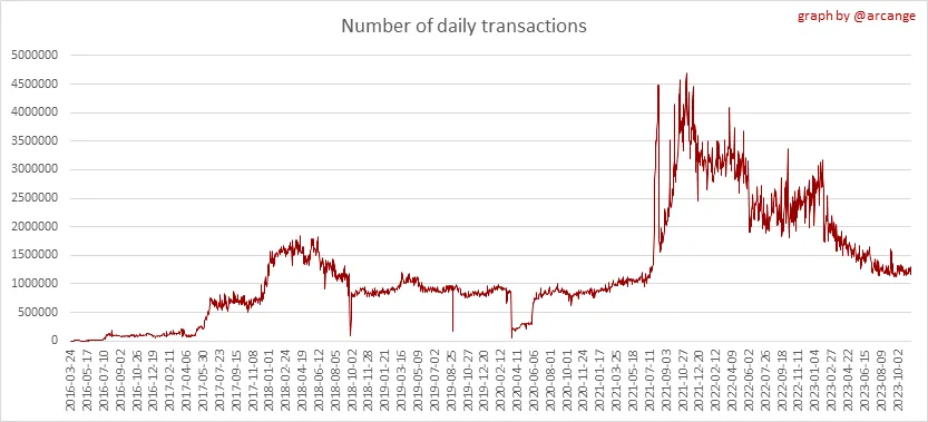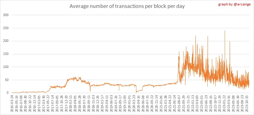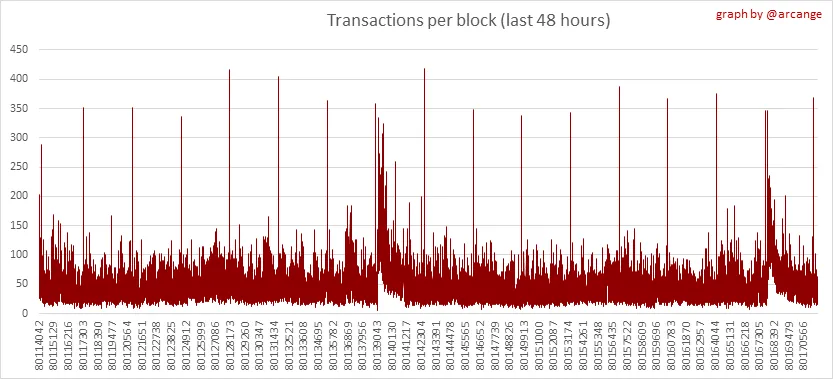 These graphs show the number of transactions per day, and the highest number of transactions per block, the average number of transactions per block, and the number of transactions per block for the last 48 hours. This gives you an idea of the whole activity on the blockchain.