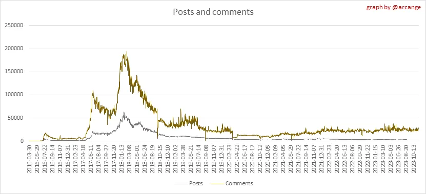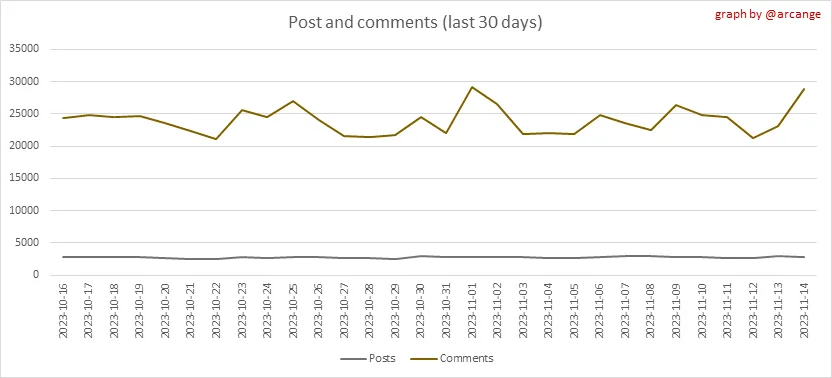 These graphs show the evolution of posts and comments for the whole blockchain lifetime and the last 30 days.