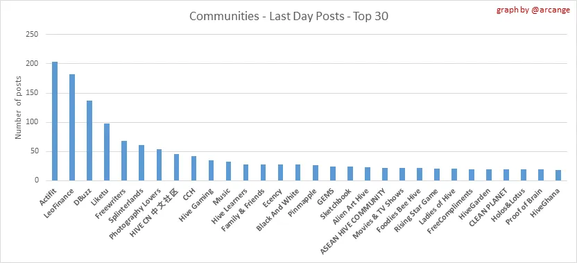 These graphs show the most active communities by number of posts (blockchain lifetime and last day).