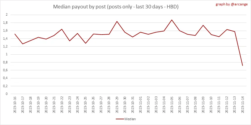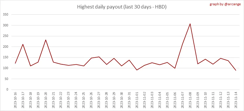 This graph shows the highest reward paid on a post (or comment) for the last 30 days.