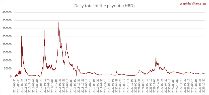 These graphs show the total of the distributed payout (posts and comments) for each day.