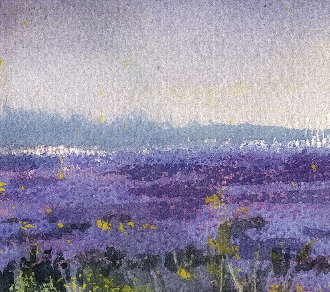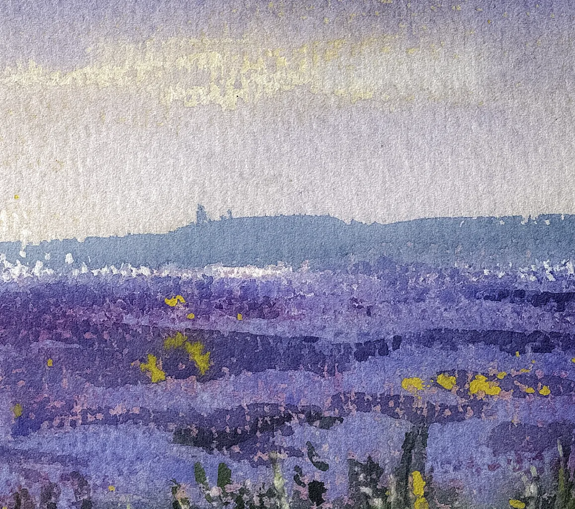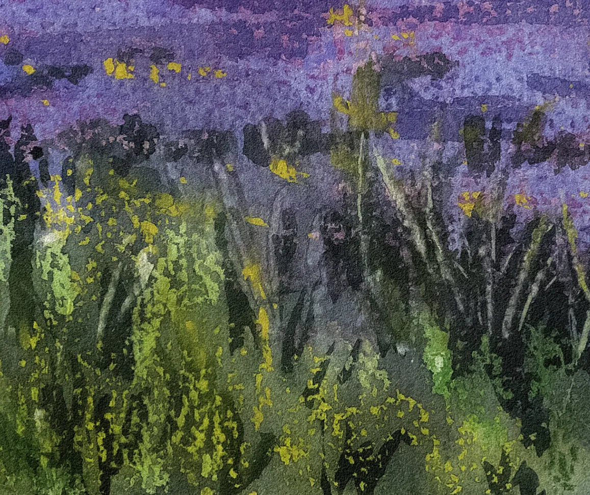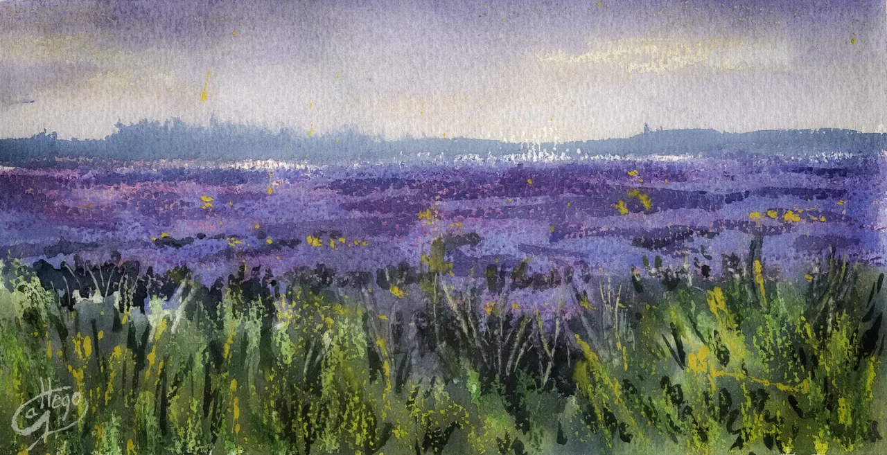 Un atardecer veraniego en los famosos campos de lavanda de la comarca de la Alcarria. Con la puesta de sol, el cielo y el mar de flores se funden en un paisaje teñido de tonos morados, malvas, púrpuras y violetas.