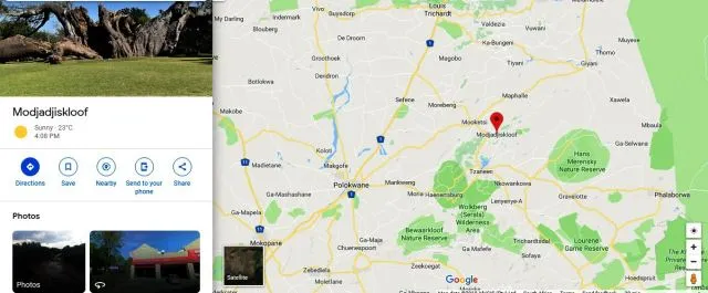 So that was where we were headed now, to the famous old baobab tree near the town of Modjadjiskloof. The town is marked with a red `pin’ on the map above.