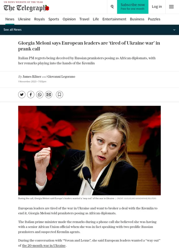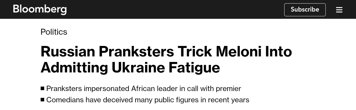 https://www.bloomberg.com/news/articles/2023-11-01/meloni-tricked-into-admission-of-ukraine-fatigue-by-russian-duo#xj4y7vzkg