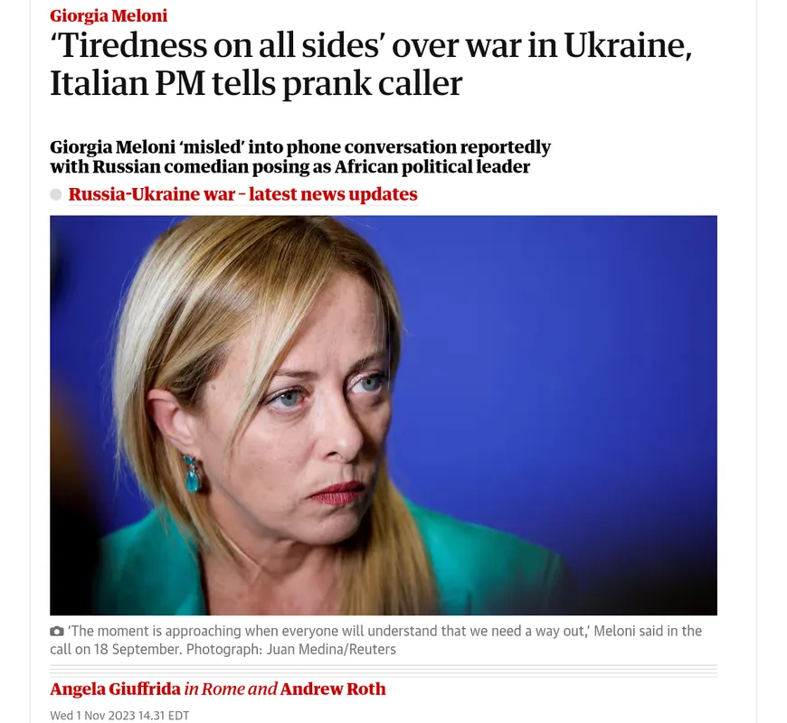 https://www.theguardian.com/world/2023/nov/01/italy-giorgia-meloni-prank-call-russia-ukraine-war