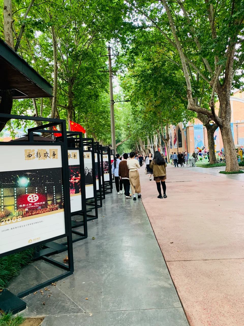 酒店在西影制片场内,路两旁都是郁郁葱葱的梧桐,被雨水清洗后的梧桐,一片片叶子就像是熠熠生辉的蝴蝶。一旁展示着历年来著名的影视作品画报及介绍,这已成为游客来西安旅游的一打卡点。