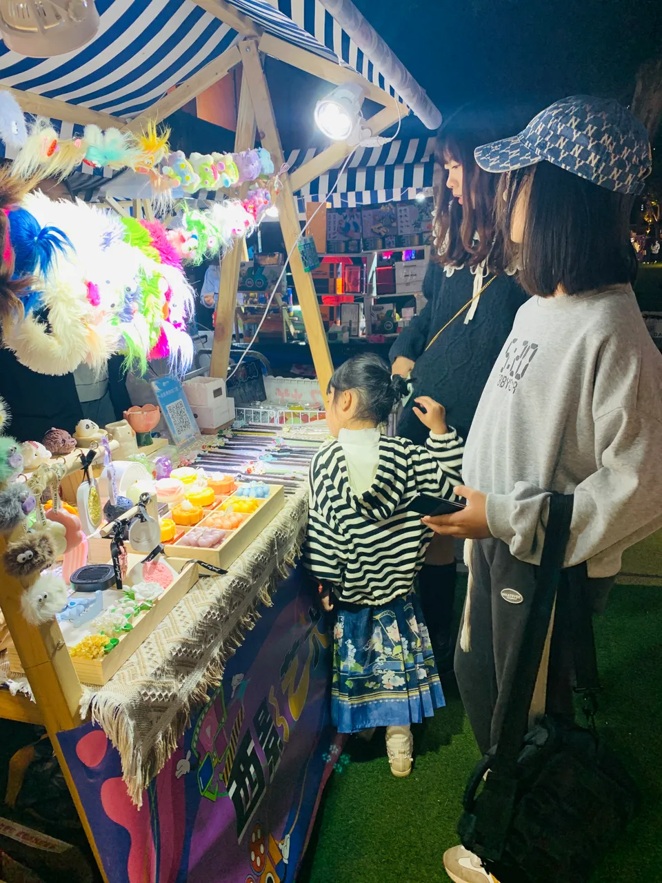 夜晚霓虹灯上,一个个独有特色的小艺术品竞相出现,小朋友们都十分好奇,好似心动;摸摸这个,看看哪个,舍不得离开。