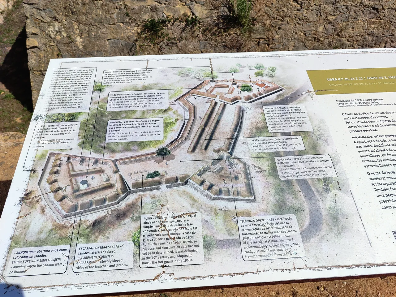 el fuerte tenia la capacidad para colocar 39 canoes y mas de 4mil soldados, aunque para no desperdiciar recursos casi siempre habian 2200 en total, el fuerte de Sao Vicente era el primero en construirse para proteger el centro del pais y desde el siglo 18 al vencer la primera batalla contra los franceses-españoles se contruyeron al rededor de la linea defensiva mas de 170. Entre los planos de la construccion de la estructura ya habia aqui una capilla que data del siglo XVII y una ruina que apararentemente podria ser de la civilizacion moro!🏰🧠👨‍💻
