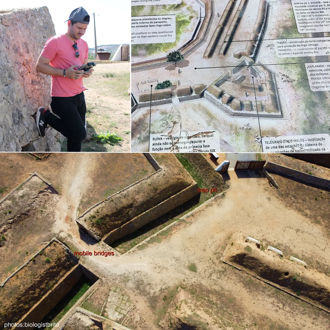 Now I am using the drone for scientific purposes and it has turned out wonderfully, piloting it here is free and you do not need permission but be careful, I do not recommend raising it higher than 50 meters because there is an airfield very close! The advantage of using the drone for photographs is that at these angles we can see the details of the fort, such as the bridges that were mobile at the time, and we also see the traps that surrounded the fort and could place water or traps that would infect wounds.🏰🧠🧭