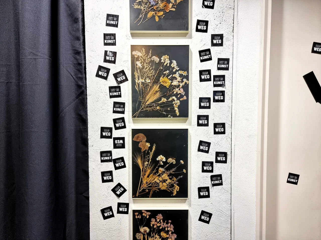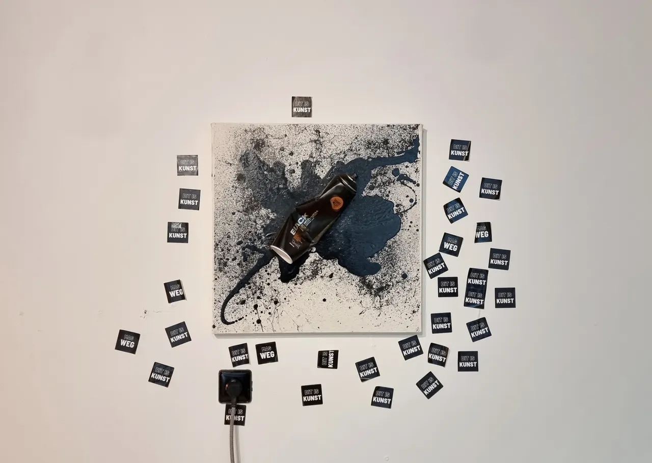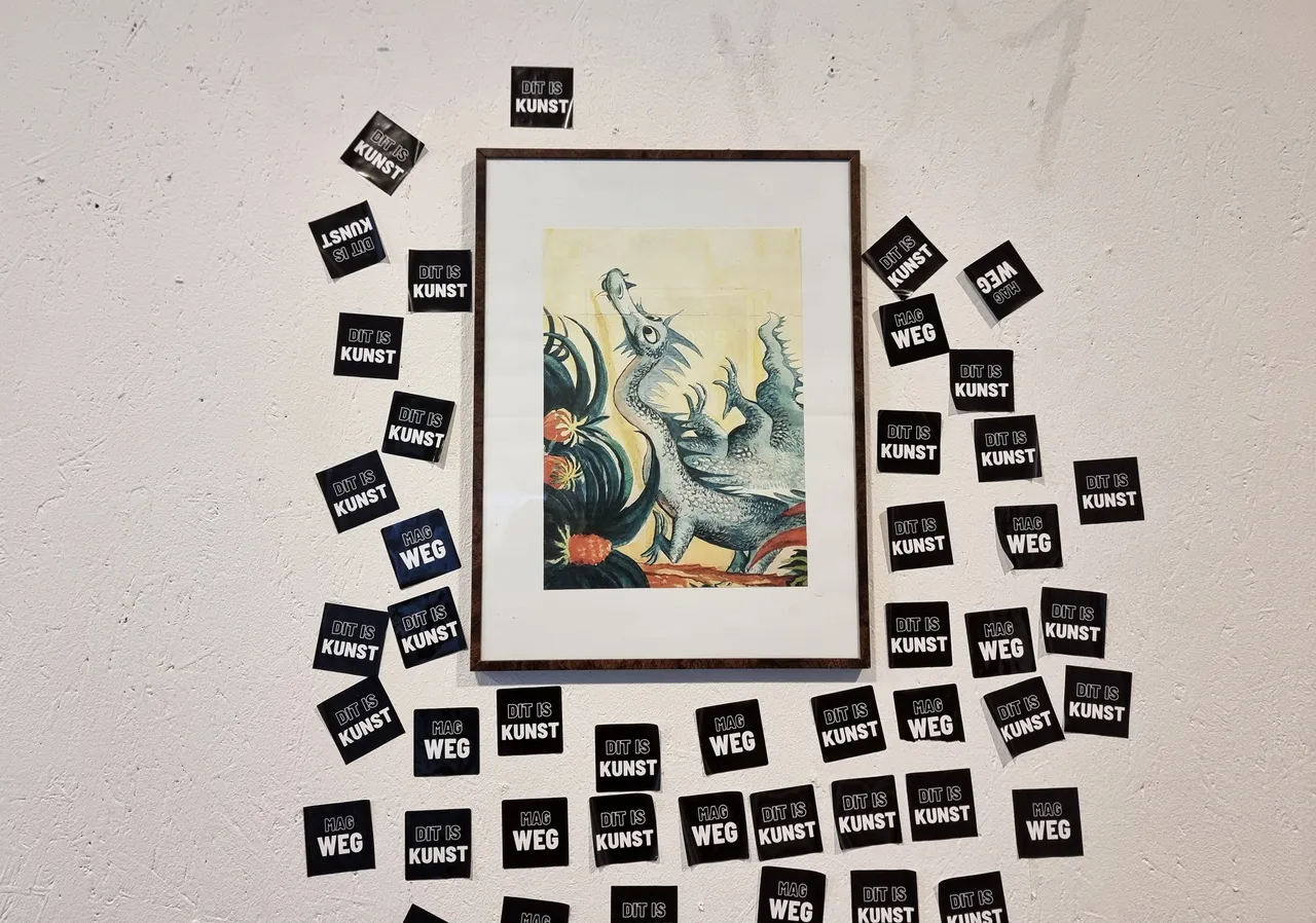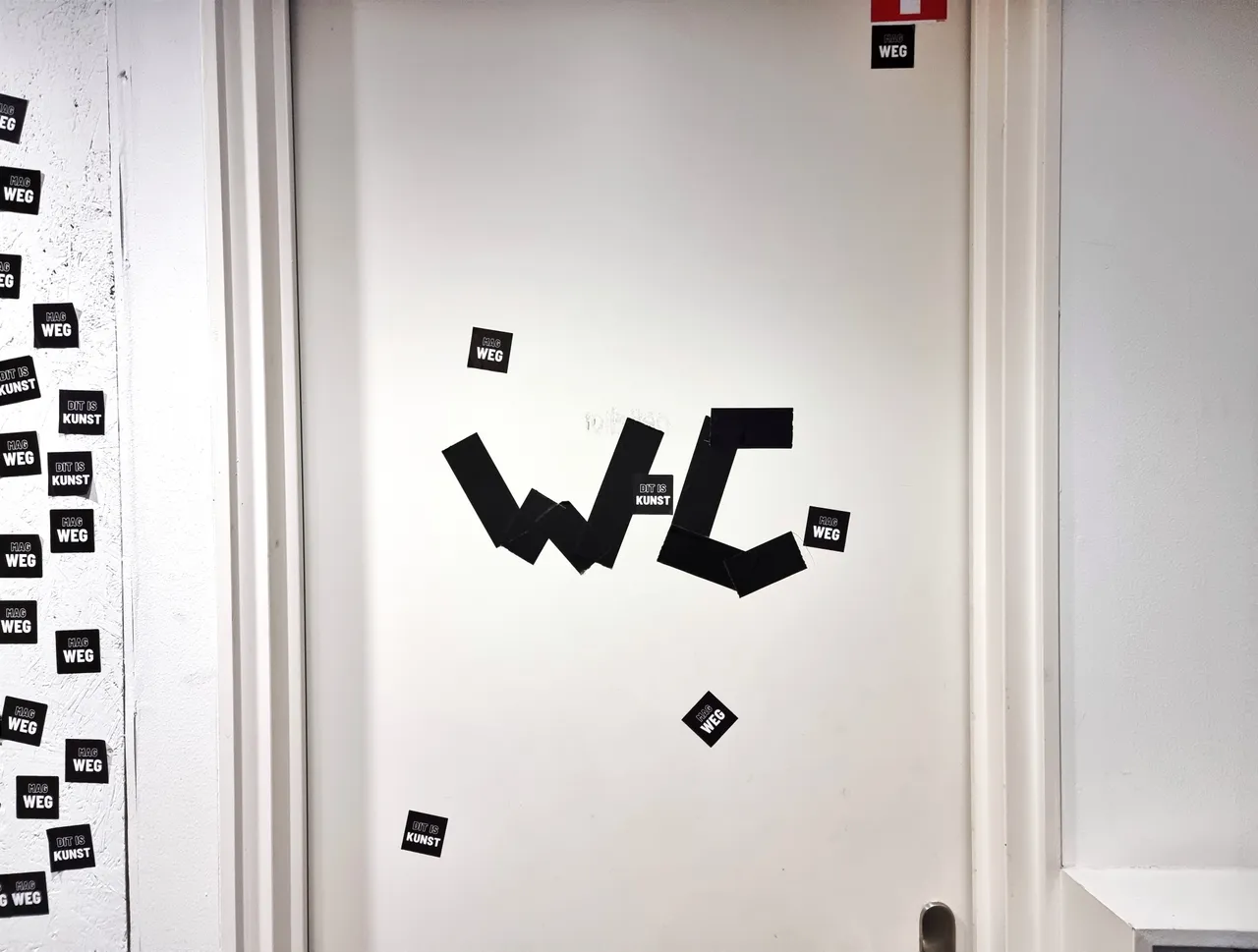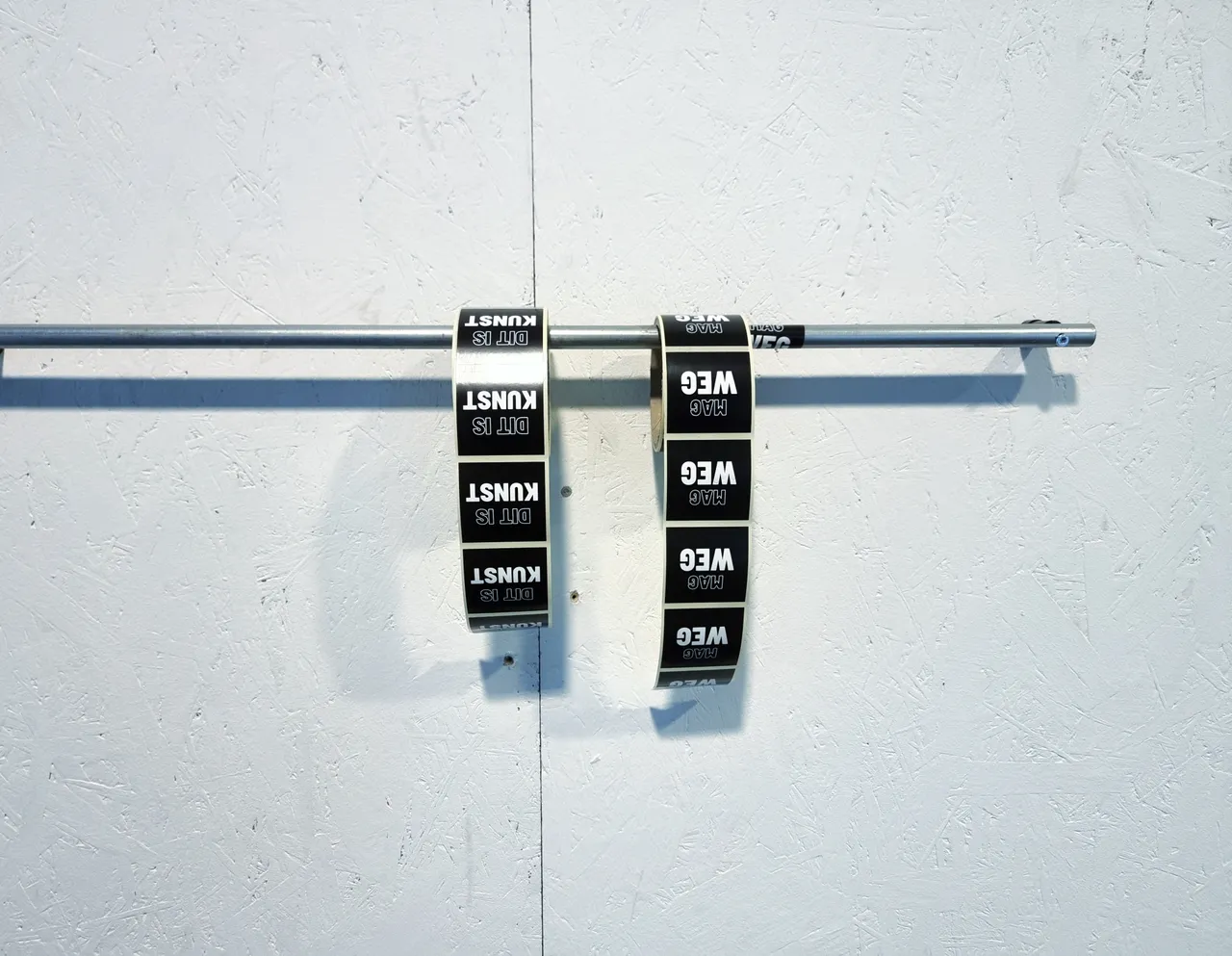 The two tapes hanging on an upcycled cloth rod screwed into the wall read "DIT IS KUNST" and "MAG WEG."""
