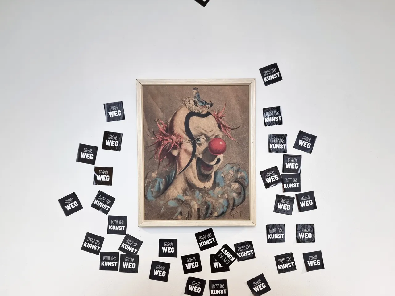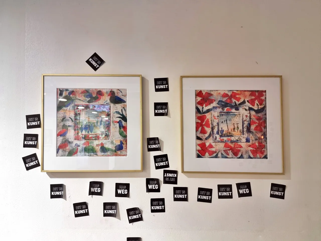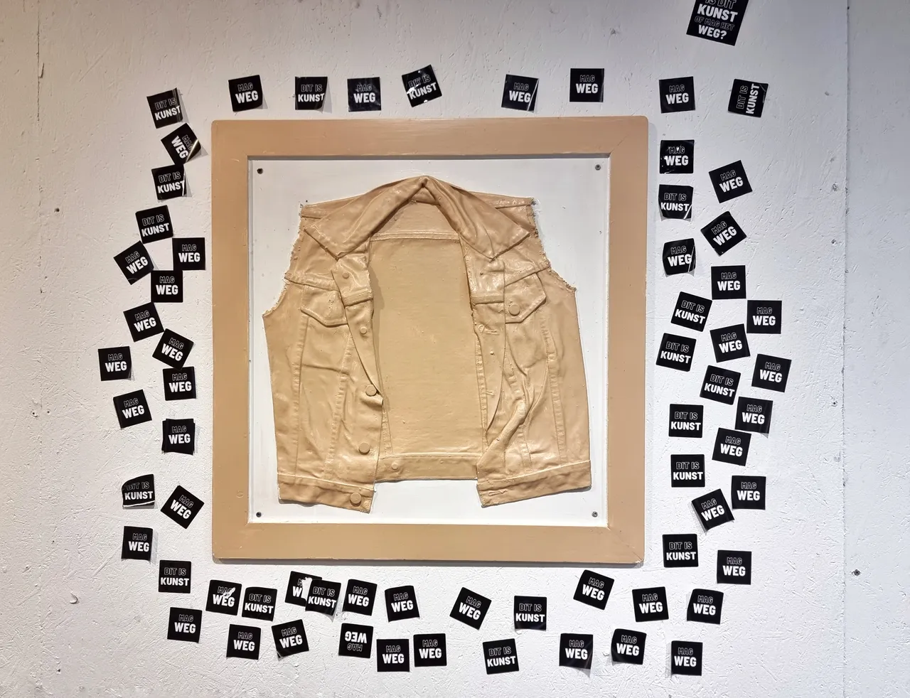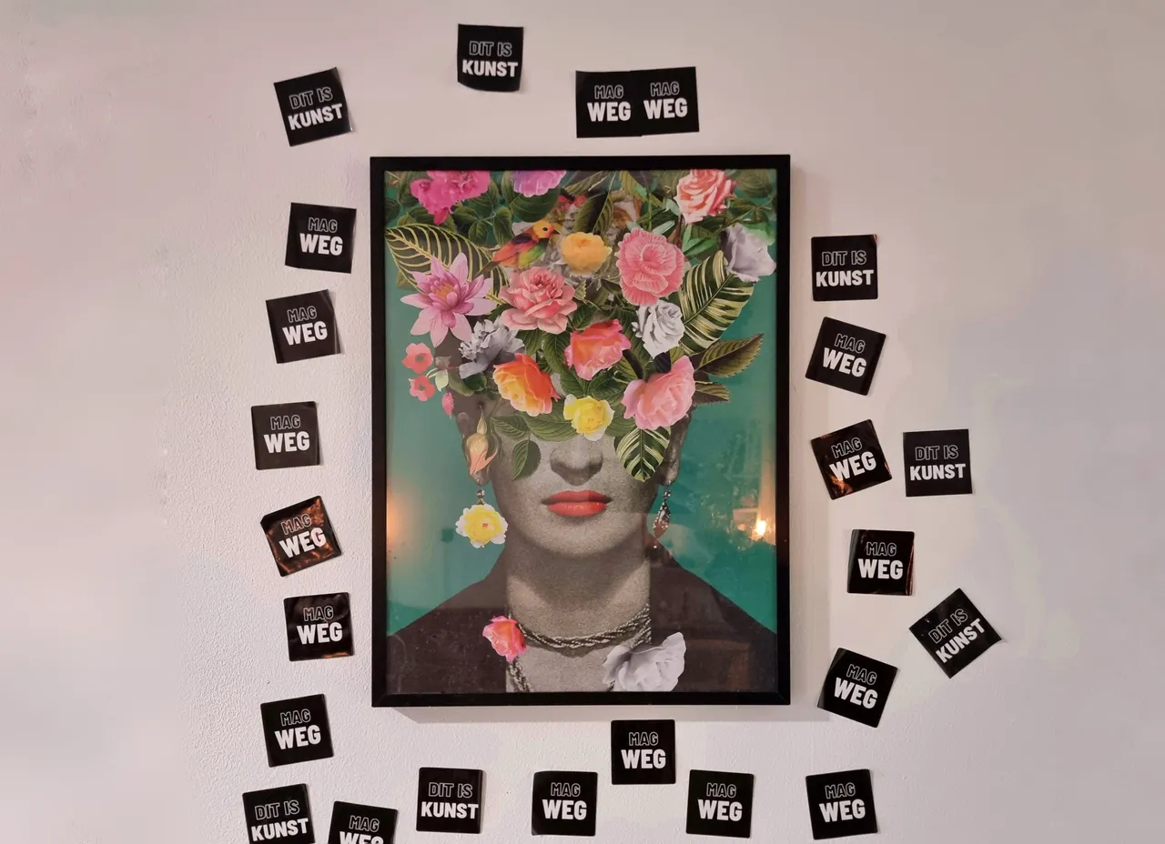 The two tapes hanging on an upcycled cloth rod screwed into the wall read "DIT IS KUNST" and "MAG WEG."""