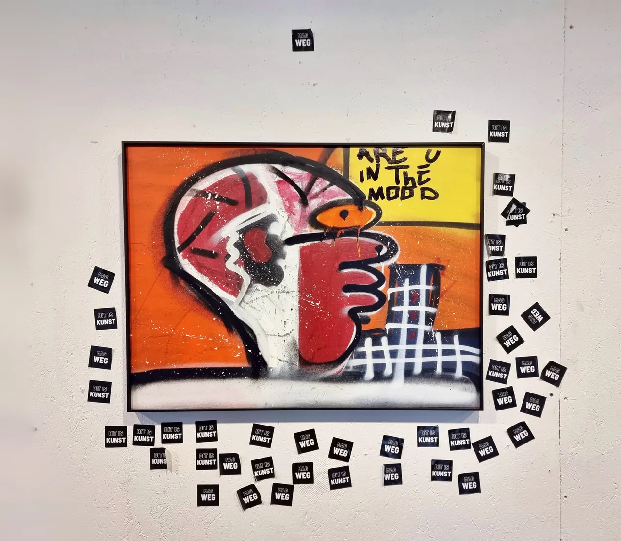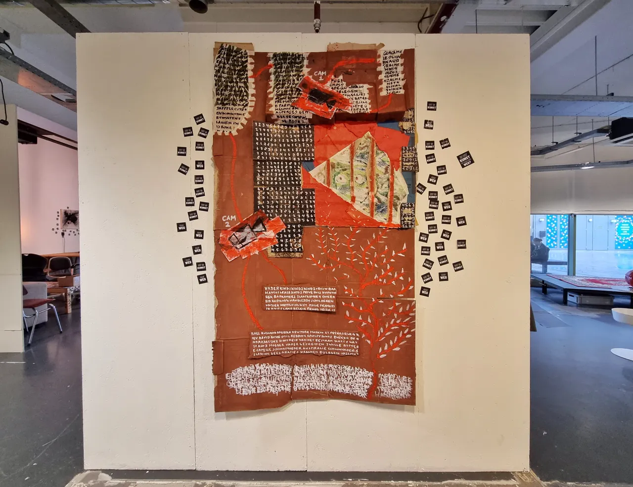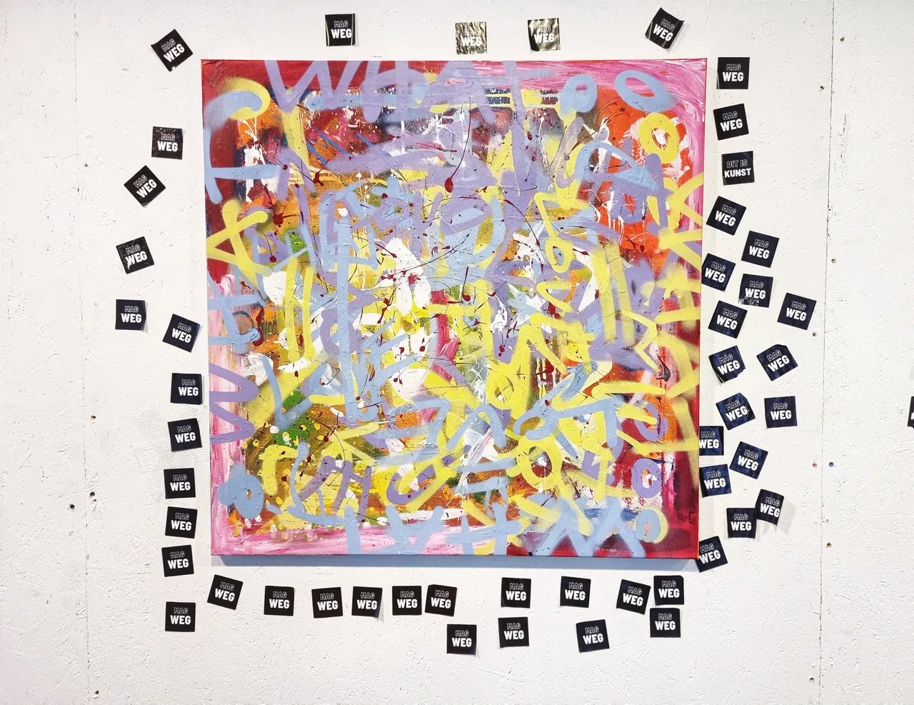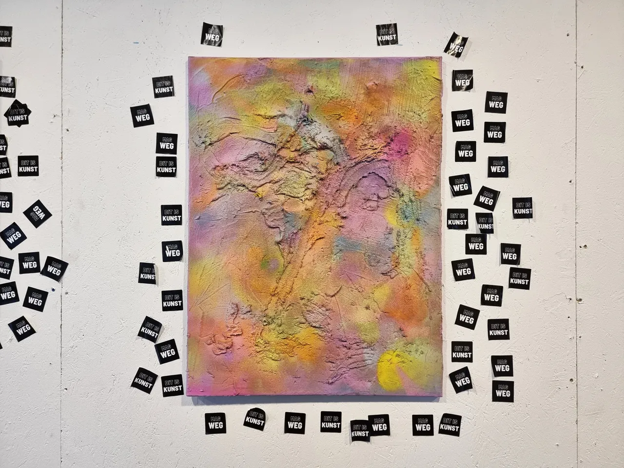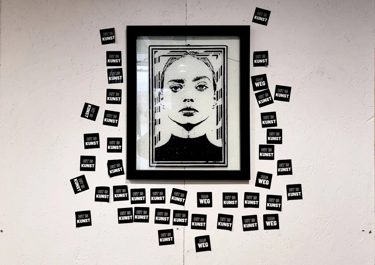 The two tapes hanging on an upcycled cloth rod screwed into the wall read "DIT IS KUNST" and "MAG WEG."""