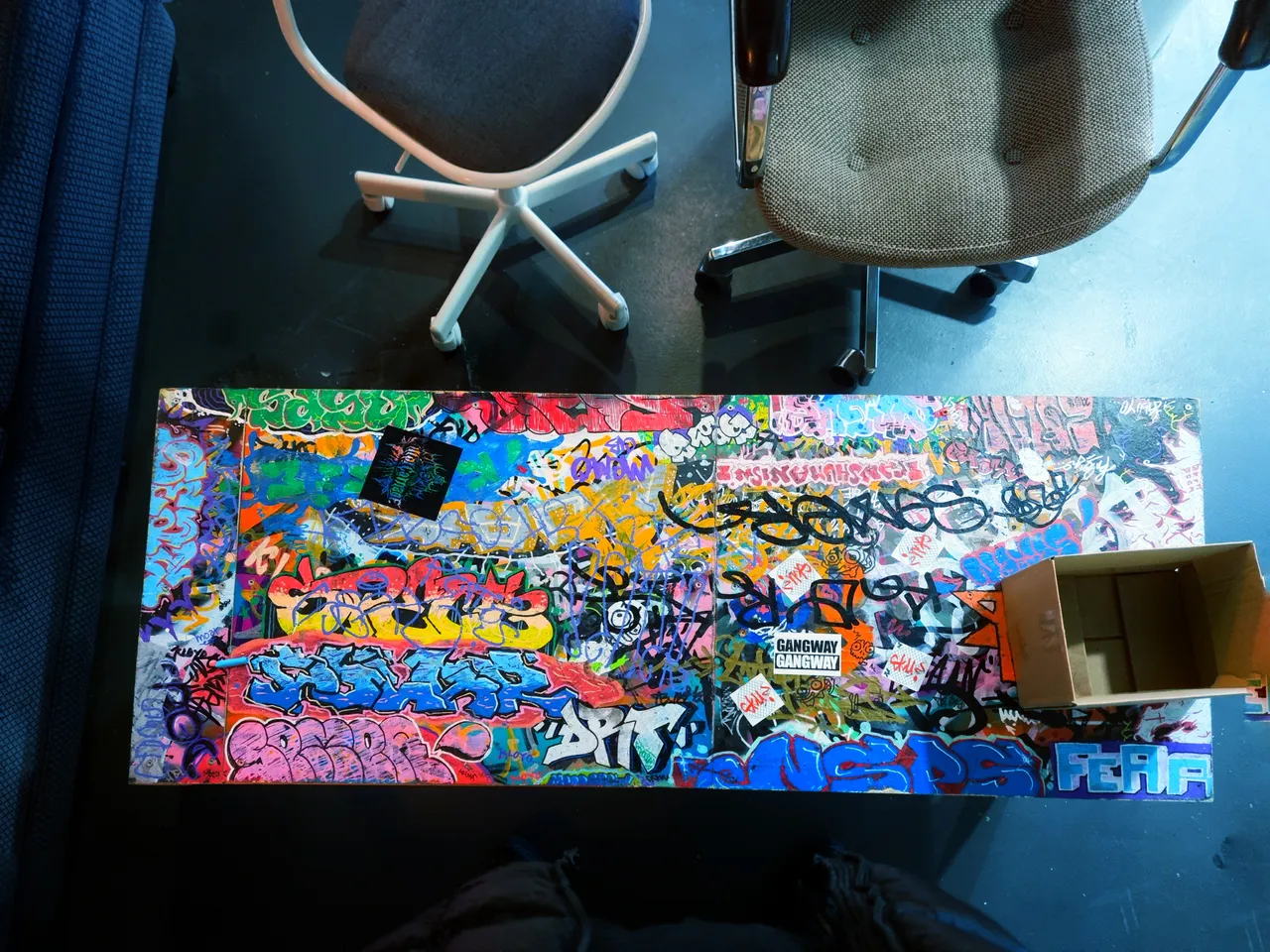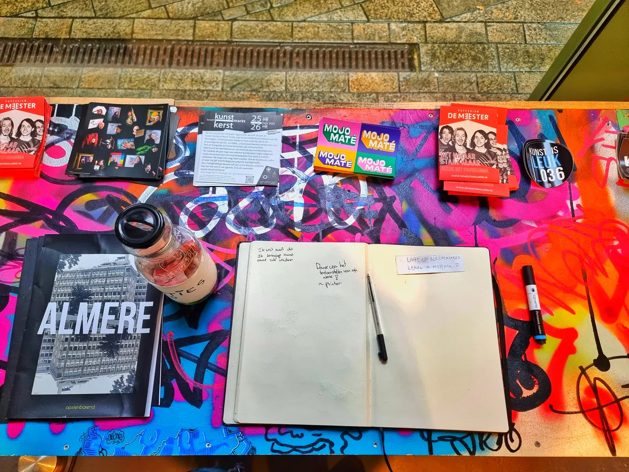 "Thank you for exhibiting my artwork." said Printer, one of the artists whose work is put up in this exhibition. The table designed with colours and paint, hosting ads, and stickers.