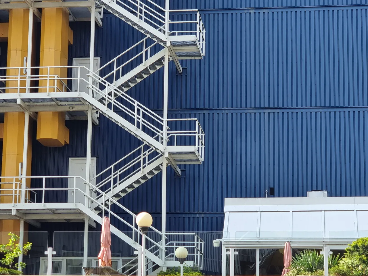 Exposed escape staircase, brightly colored and literally over the top vent pipes, standing loud and clear. It is gorgeous in itself.