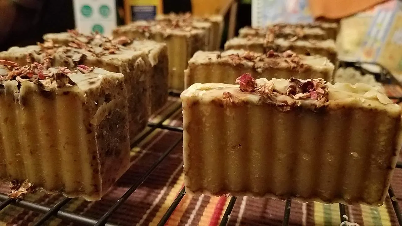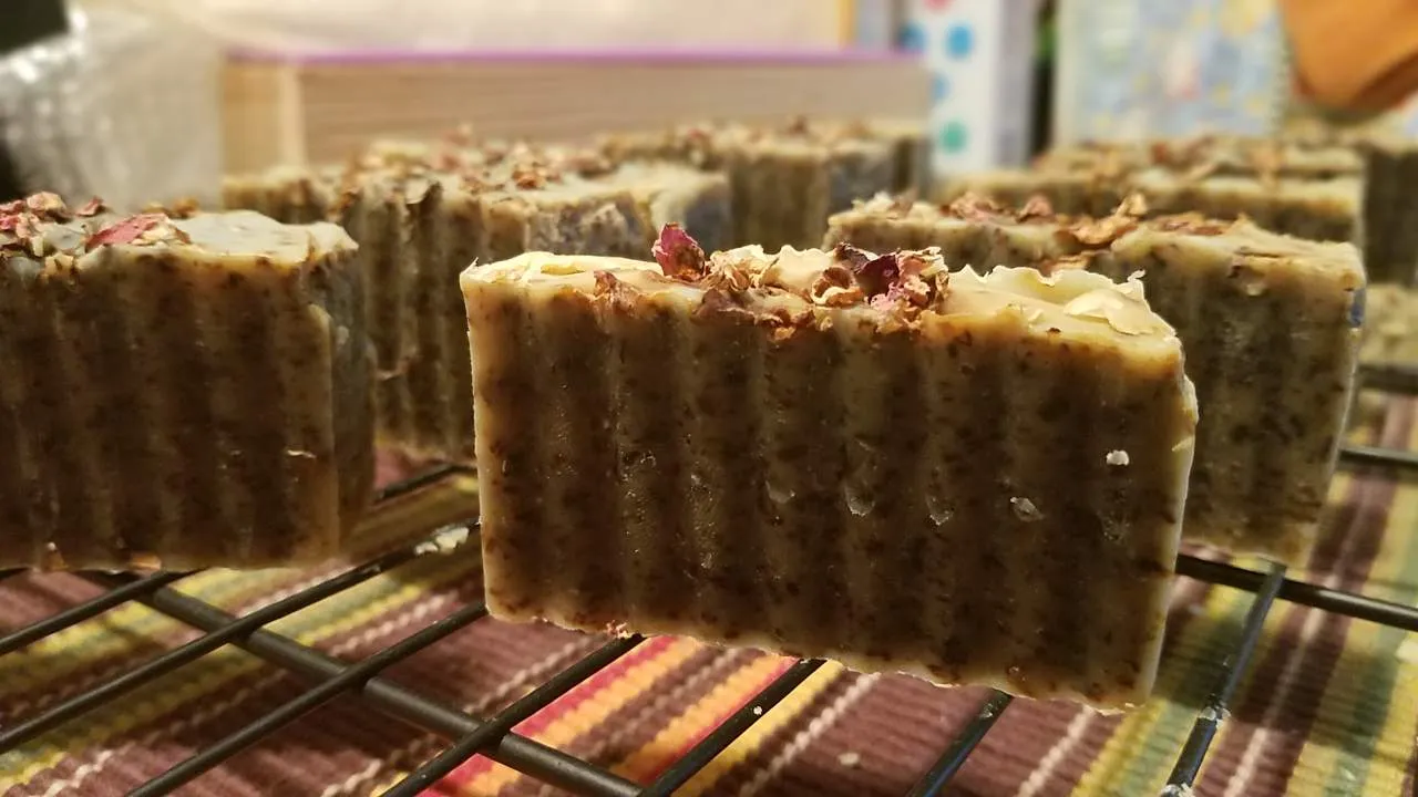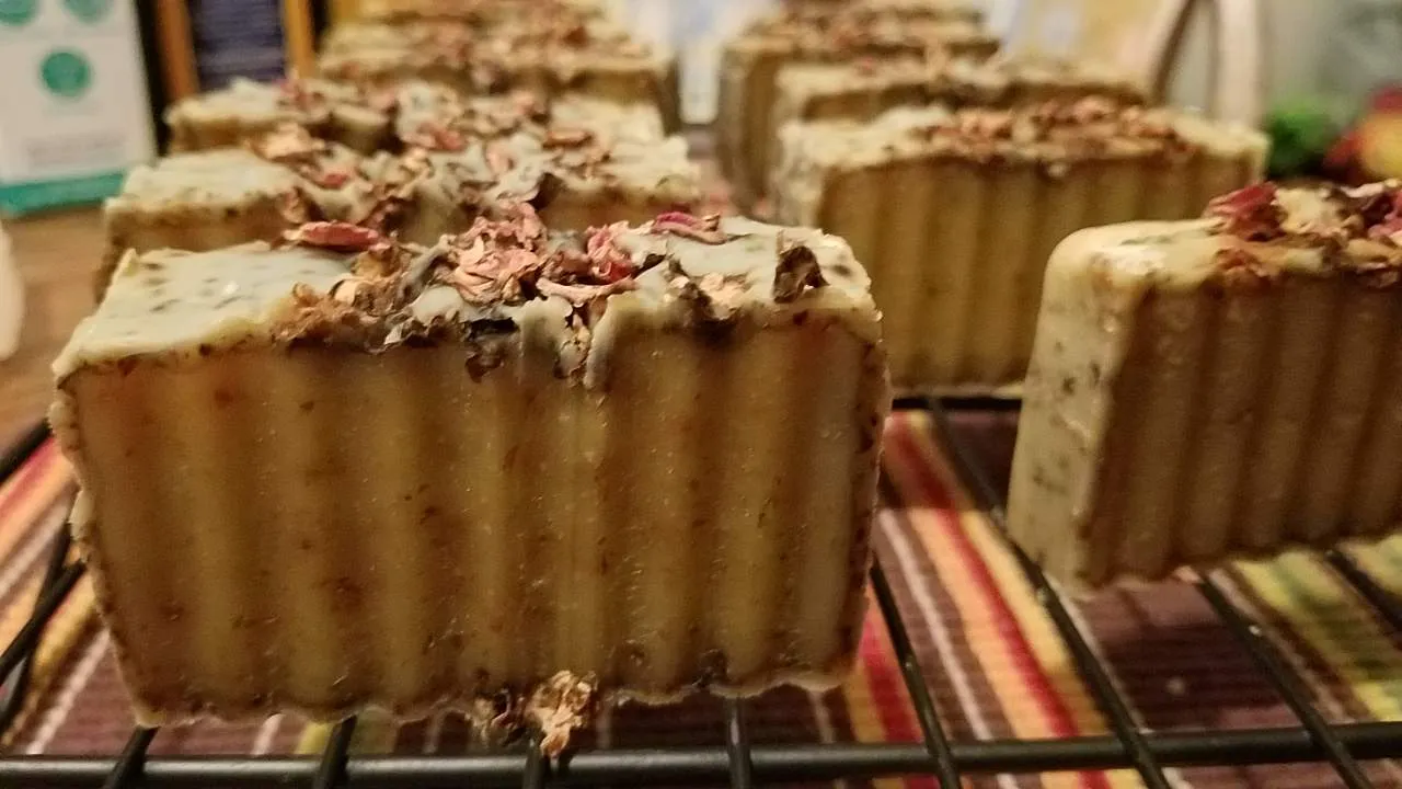 Ingredients: Extra Virgin Olive Oil, Distilled Water, Sweet Almond Oil, Sodium Hydroxide, Cocoa Butter, Castor Oil, Hemp Seed Oil, Pink Roses, Lemon essential oil, and Geranium essential oil.πŸ‘©β€πŸ”¬