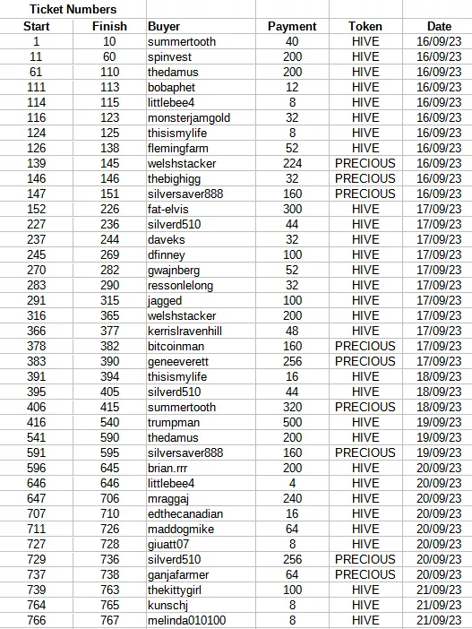 If you have sent HIVE or PRECIOUS Tokens to the @ssg-community account then you should be able to find your name on the list below to find out what your ticket numbers are. This will be important if you are intending to be present at the LIVE Draw as you'll need to be on the ball to make your prize choice in the time allocated and it'll help to know if your number comes up.
