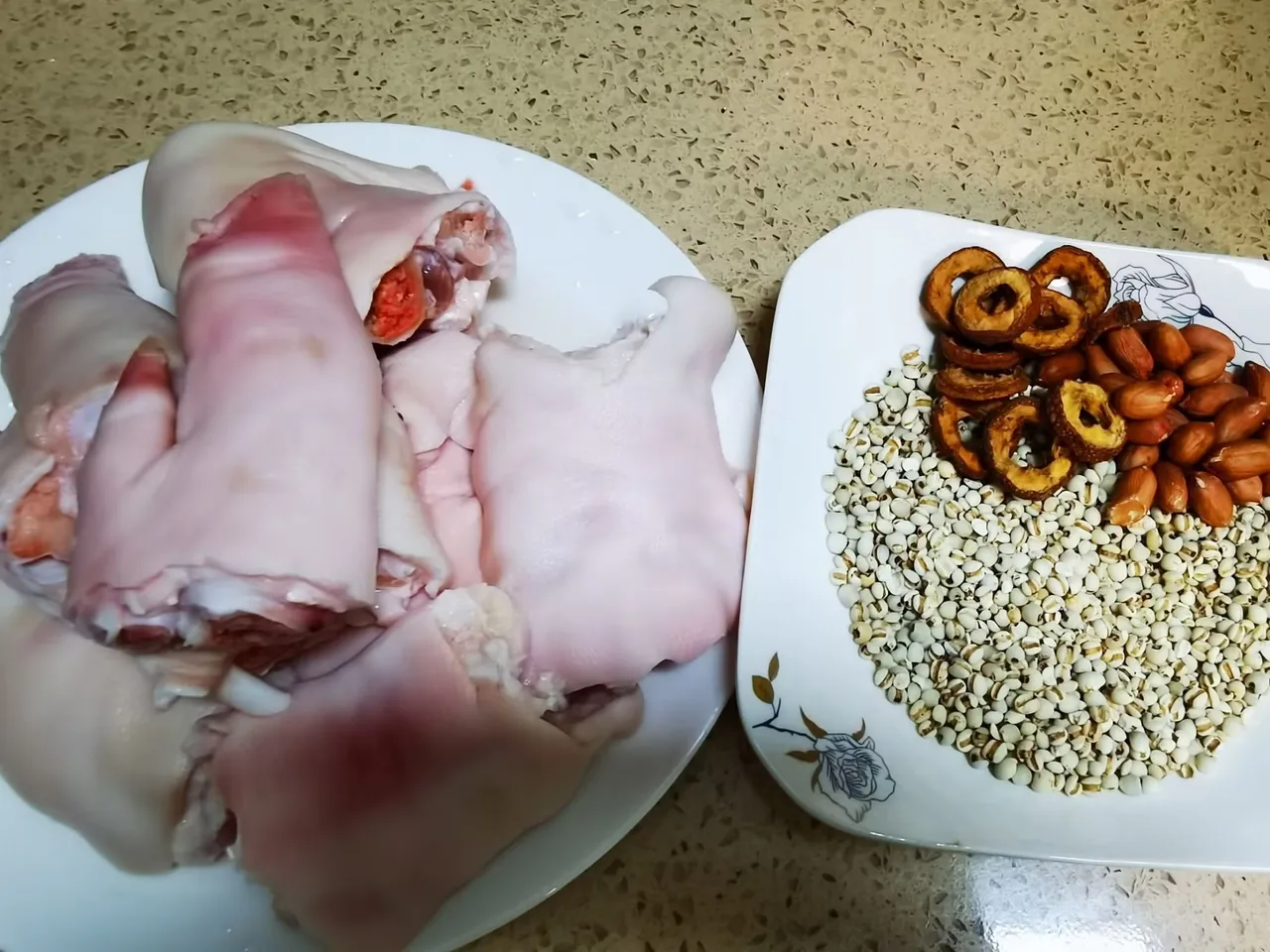 准备的食材:猪蹄一对,薏米100克,花生50克,山楂片适量 。
