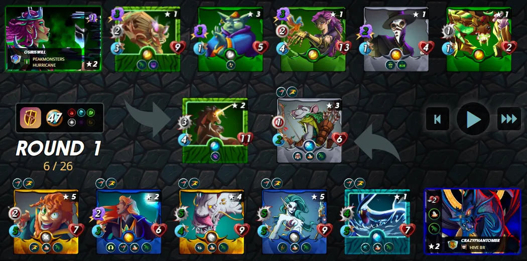 O adversário utilizou o card Oaken Benemoth que é incomum, ao menos para minhas partidas. Sua equipe foi bem escolhida e não havia nenhum problema em sua estratégia. Mas eu apostei mais alto, e com grandes apostas temos grandes recompensas!
