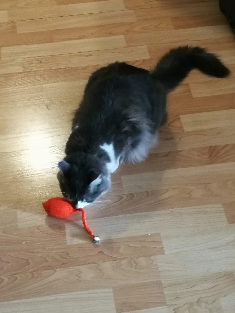 That's a hand crocheted mouse with a bell on the tip of its tail. Perfect to play with at 5am just before the sunrises. The best time for a cat to play with toys are in the wee hours of the early morning after the hoomans have been up celebrating the long weekend.
