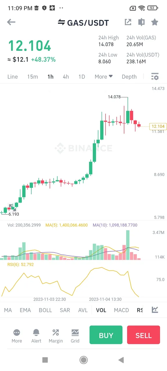 Gas coin has increased by 48% at each coin price @$12.102with a chance of rising soon @$13.000 price level in upcoming 8 hours a very competitive and impressive coin prices trading we have seeing through coingraph data indicating this signal light BLACK , RED and GREEN ( sells and purchases strategy ) the technical indicators are suggested this On November 4th, 2023, the world was buzzing with excitement as the crypto market witnessed an astonishing surge in the price of GAS coin. Investors and enthusiasts had been closely monitoring the digital asset for quite some time, and their patience was about to pay off.