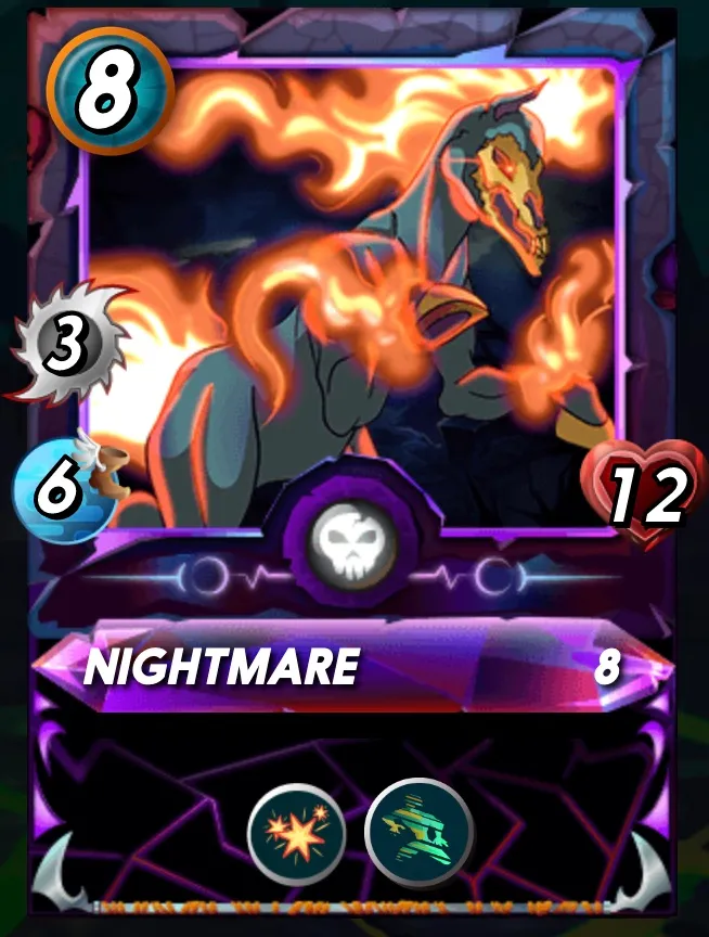My favourite card has to be Nightmare, a common card that at level eight brings some awesome skills to the battlefield, so what's so great is that the speed is at 6, which means he usually will not miss and has a high chance of being missed. Think that magic attacks are safe, think again, this guy gets phase a recent ability that means he can also dodge magic attacks. To top it off he has lots of health a decent 3 melee attack and a blast to round off a very capable Tank.