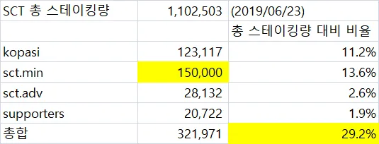 이렇게 되면... 소각글에 보팅 지원가는 계정들의 파워 총합이 총 SCT 스테이킹량의 거의 30%가 되어버립니다.
