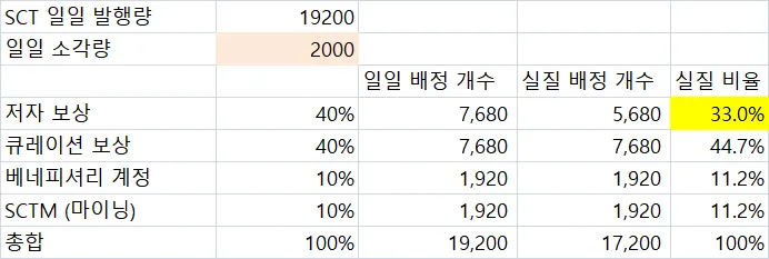 그런데 이 소각 비용은 결국 저자들이 전액 부담하는 구조인만큼, 소각비용이 늘어나면 저자 보상 총액이 줄어드는 효과를 가져옵니다. 보수적으로 지금까지의 추세인 2,000SCT만 소각된다고 해도, 아래 표에서 볼 수 있듯이 저자보상이 일일 실제 분배량의 33% 수준으로 떨어집니다 (원래는 40%죠.)