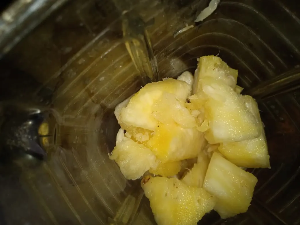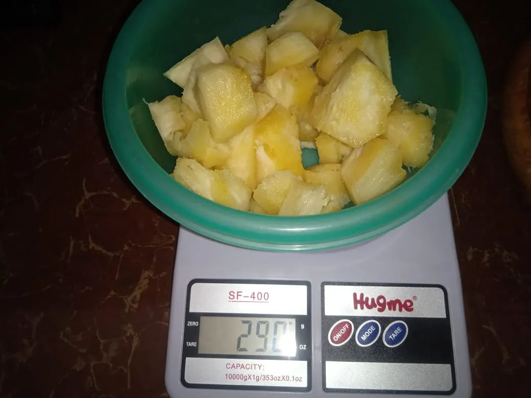 To start preparing this juice, peel the pineapple, cut it into small pieces, weigh and set aside.