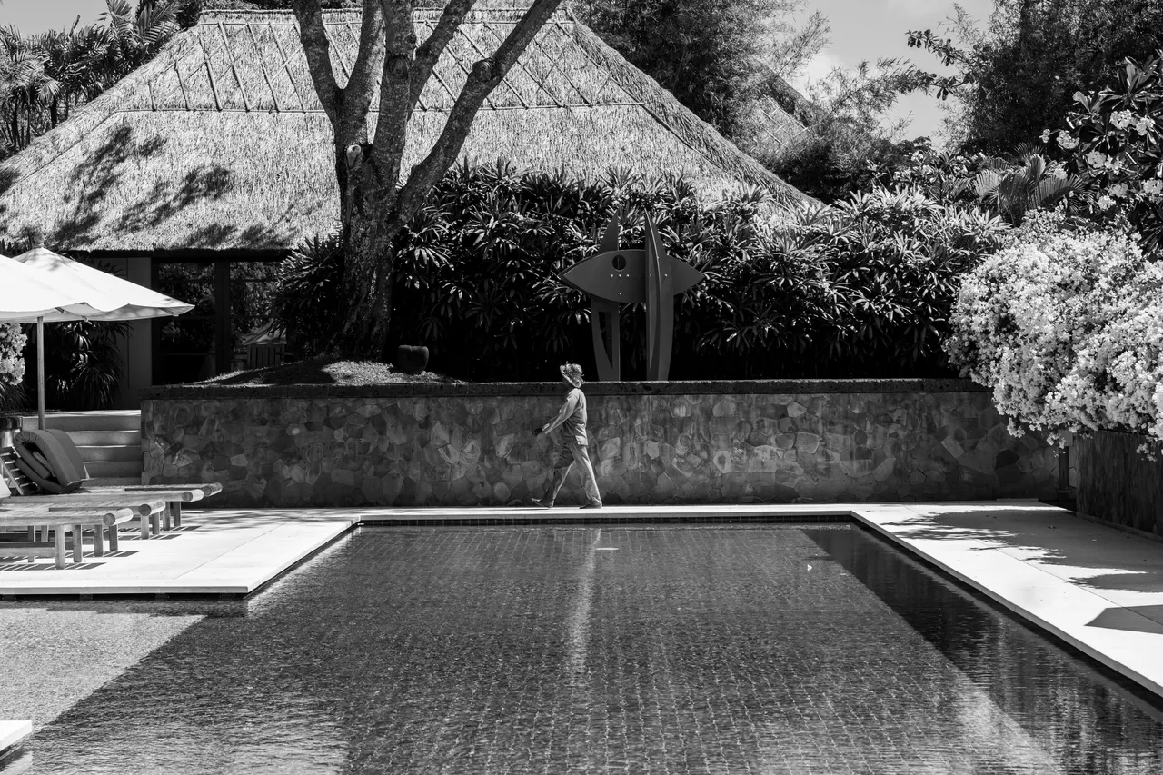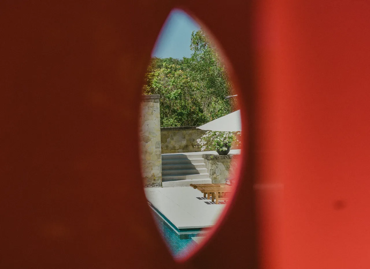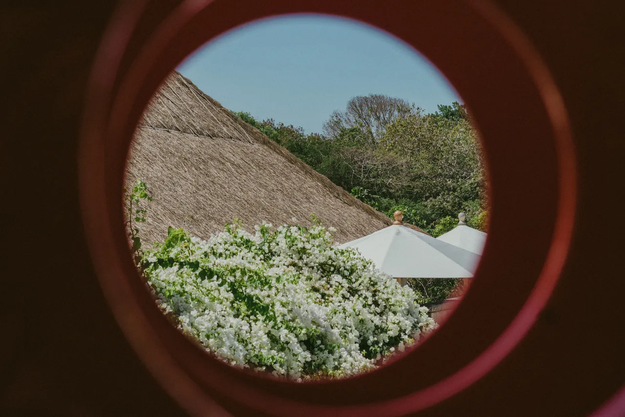 A Peeking shot that I took from the hole in the fish statue that Derta passed in the first photo. You can see the Bougainville, the roof of the room, and the pool umbrellas.