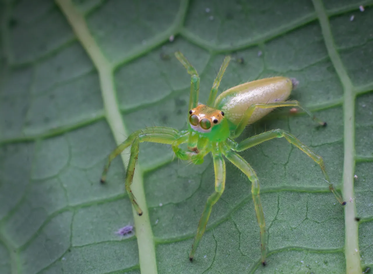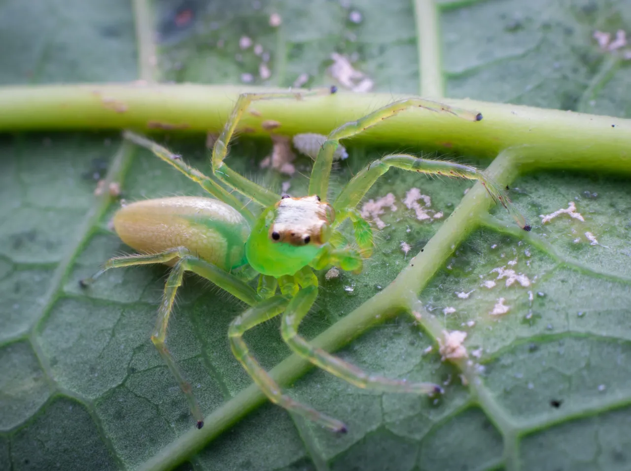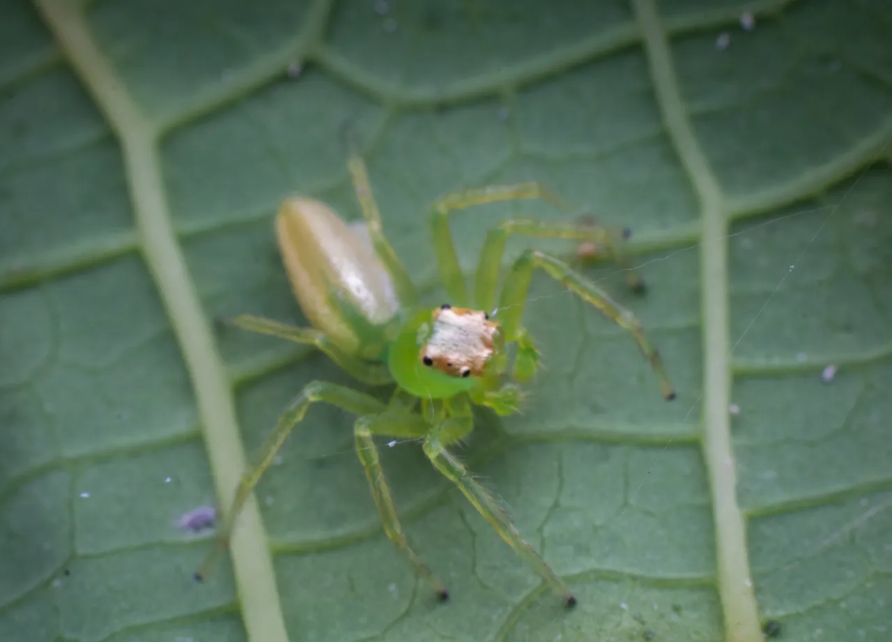 This green jumping spider seems to be quite young when I see its color. I found this little guy on top of papaya leaves in my uncle's house. I don't think that I will get many photos of this spider since it hiding in a difficult spot.