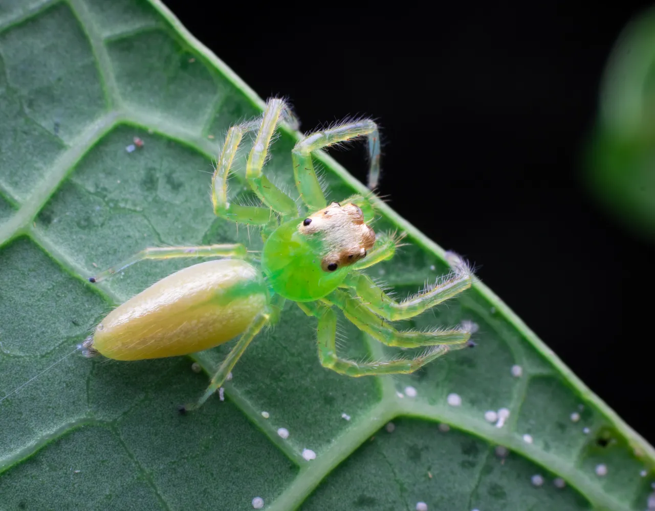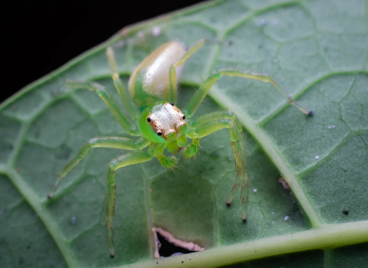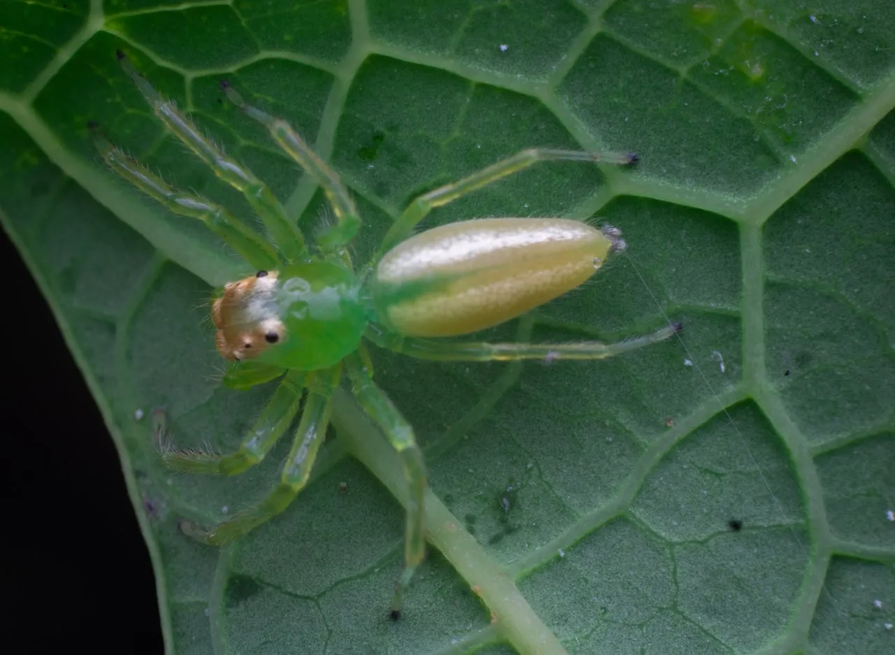 This green jumping spider seems to be quite young when I see its color. I found this little guy on top of papaya leaves in my uncle's house. I don't think that I will get many photos of this spider since it hiding in a difficult spot.