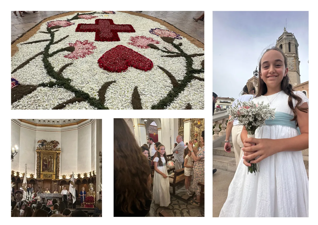 Again, we headed to the central point where all the town's festivities are celebrated. "El cap de la Vila" while the children went out in procession stepping on the carpets of flowers, together with the ecclesiastical authorities, and the bands and groups that usually accompany them.