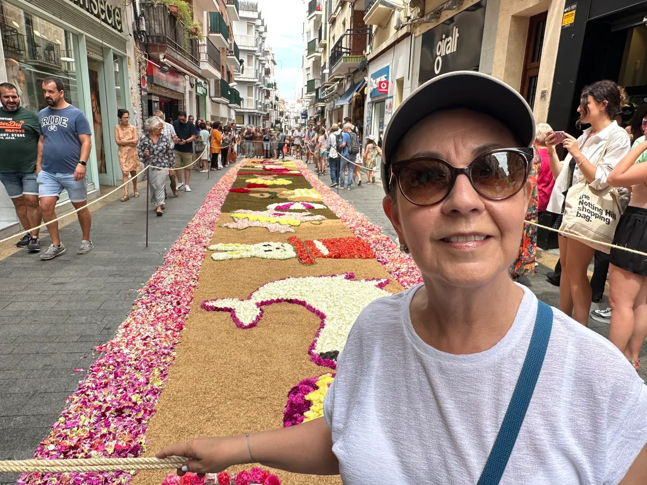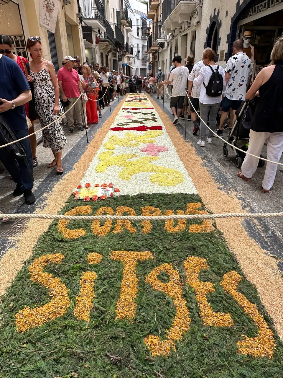 Para ello esta localidad se prepara con tiempo y organiza la elaboración de hermosas alfombras florales. Esta tradición está a cargo de las autoridades del lugar con la colaboración de la población en pleno. Participan todas las escuelas, el ayuntamiento, los vecinos de las calles y demás representantes del ámbito cultural y social de Sitges.