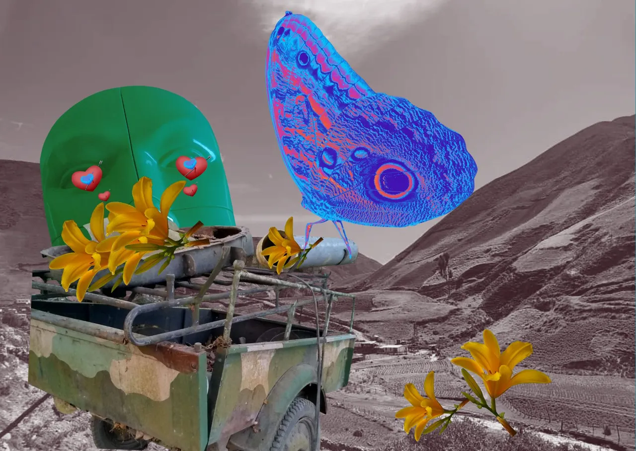 In an arid scenario, almost at the gates of the end of time, a butterfly arrives delivering yellow flowers.