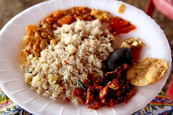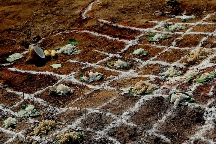 Leaves covered in various rice and other food combinations for ceremonial purpose~