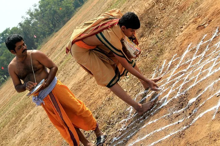 One of many ceremonial aspects of Puja--drawing a sacred geometry grid in powder.