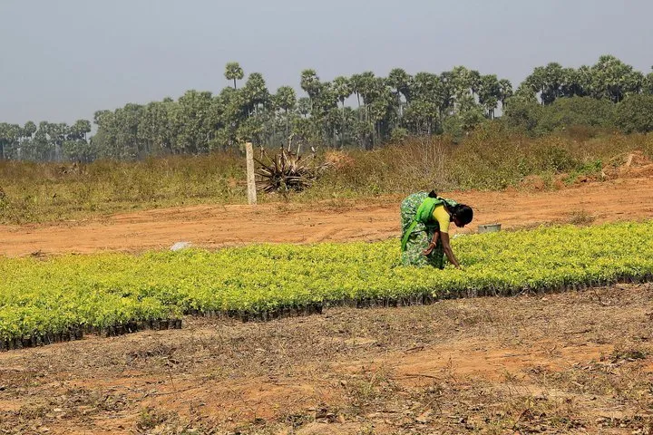 These ladies water these thousands of little trees by hand with hand carried water that is hand pumped each day~ALL of this is done to grow these little plants to one day plant in this 10 acre field which has been clear cut to develop.