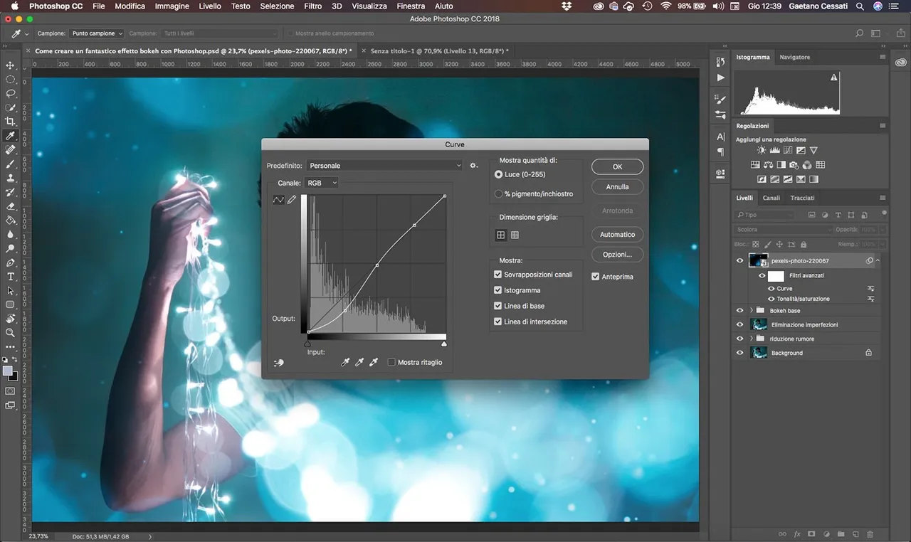 Dunque, per dare un tocco in più al mio lavoro ho inserito una nuova immagine con dei bokeh e l’ho ingrandita tanto da far sembrare gli elementi luminosi in primissimo piano. In questo caso l’immagine che sono andato a inserire aveva un alone bianco che alterava troppo i colori del soggetto. Per eliminarlo ho usato lo strumento curve (vedi fig. 13) e siccome ho lavorato su un oggetto avanzato, ho attivato le curve da menù LIVELLO > NUOVO LIVELLO DI REGOLAZIONE > CURVE.