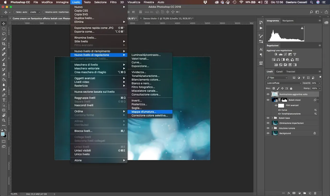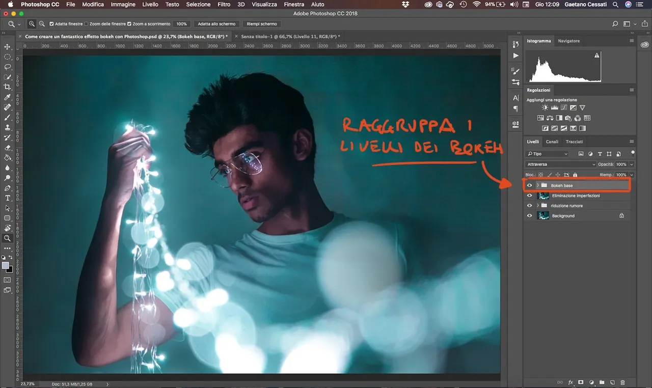 Se hai usato più di un livello con bokeh, ti consiglio di creare un gruppo per raccoglierli tutti, io l’ho chiamato “Bokeh base”. In questo modo mantieni ordinato il pannello dei livelli.