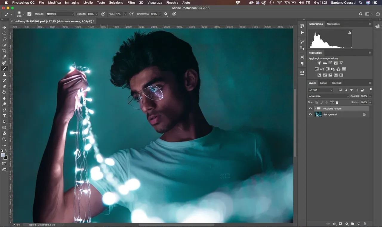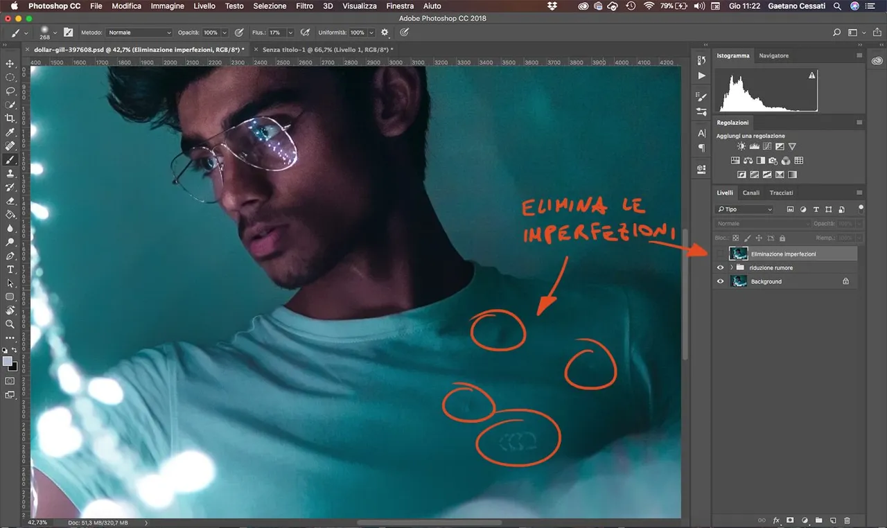 Apri in Photoshop la fotografia con il soggetto, così da averla come livello Sfondo. Duplica il livello e procedi con gli aggiustamenti di base. L’immagine che ho usato presenta parecchio rumore, visibile soprattutto nella porzione di muro in alto a destra, quindi il mio primo passaggio è stato quello di ridurre il rumore digitale. Dopodiché sono passato alla rimozione delle imperfezioni (borse sotto gli occhi, impurità della pelle, ecc.).