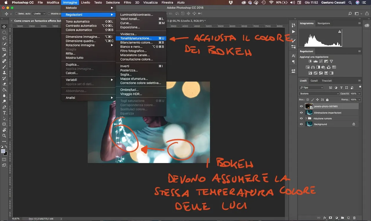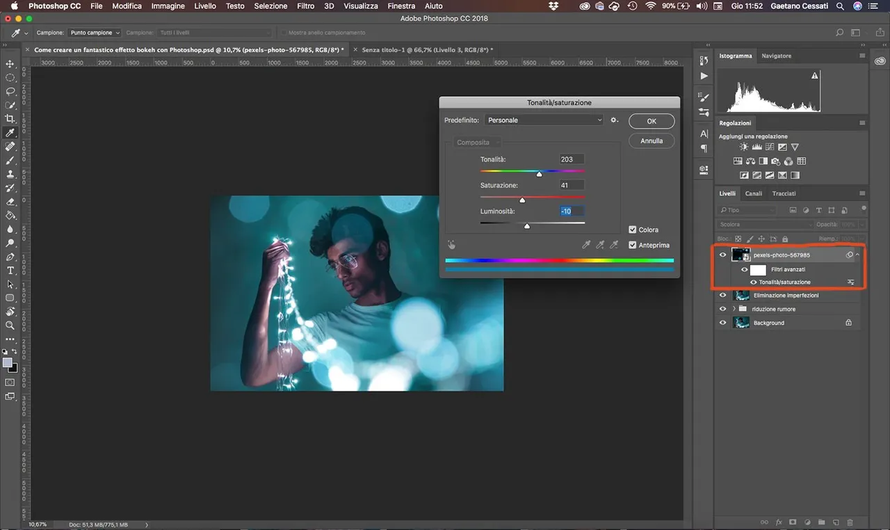 • Usa lo strumento tonalità/saturazione per modificare la temperatura colore del bokeh, per dargli un colore il più simile possibile a quello delle luci del livello del soggetto