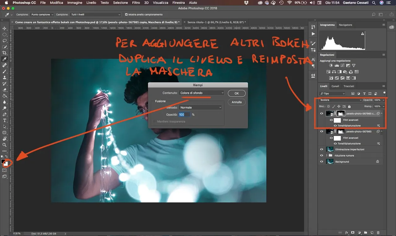 Se ritieni necessario aggiungere più bokeh, duplica il livello e reimposta la maschera di livello cliccando sulla sua miniatura nel pannello dei Livelli, poi da menù MODIFICA > RIEMPI e seleziona il colore bianco, o nero, a seconda di come stai utilizzando le maschere (vedi fig. 9). Adesso sei pronto per ripetere l’operazione di mascheratura dei dischetti luminosi in eccesso.